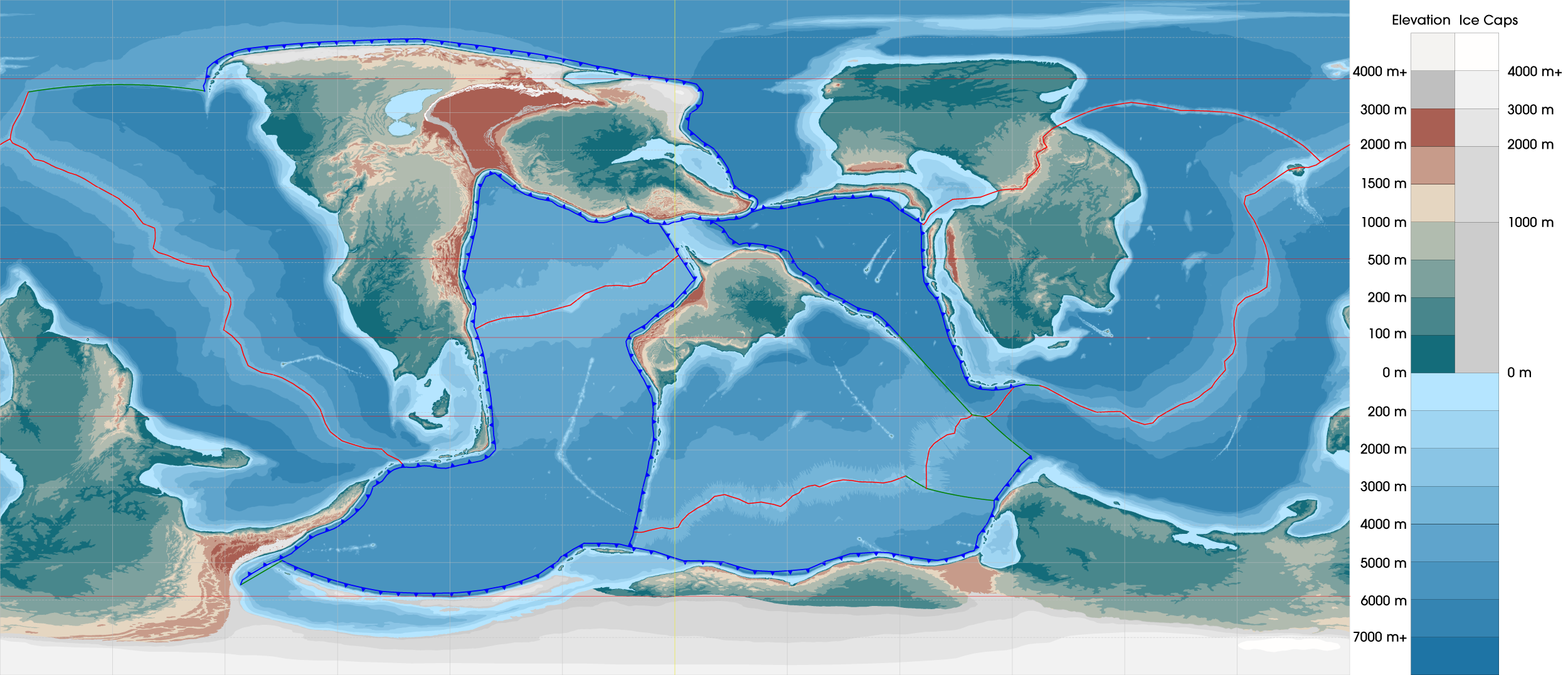 Map of CRETAK showing the planet’s topography, plate boundaries, and tropic/polar circles. Continents: PICARD (southern continent), EZRI (northwestern continent), DEGRA (central continent) & JANNAR (northeastern continent). Plate Boundaries: Blue (convergent), Red (divergent) & Green (transform). Circles of Latitudes: Tropic Circles (21º north and south), Polar Circles (69º north and south)